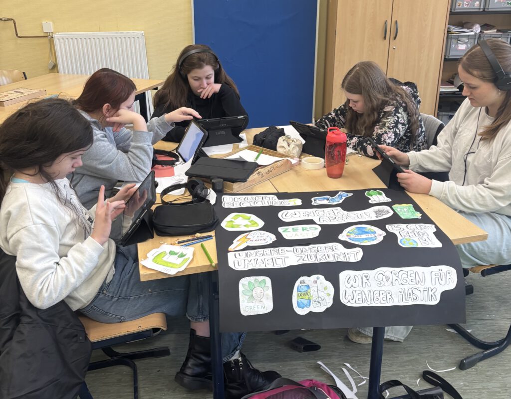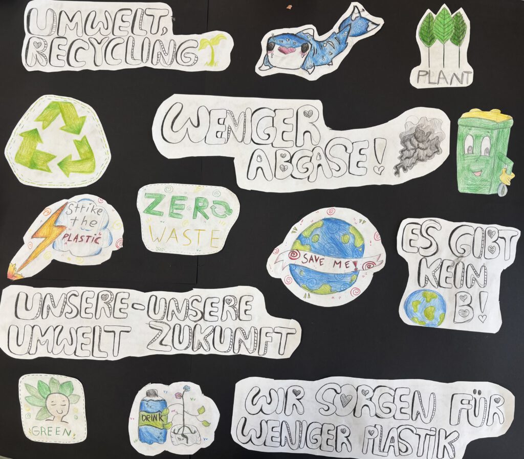 Im 8. Jahrgang entstand zum Einstieg in das Thema ein „Demokratie-ABC„, zu dem jeder etwas beitragen konnte. So konnte sich jeder in Erinnerung rufen, was er bzw. sie schon über das Thema weiß. Außerdem erhielten die Schülerinnen und Schüler allerhand Denkanstöße, denn im Anschluss wählten sie eigene Schwerpunkten und erstellten Präsentationen dazu. Der 7. Jahrgang wiederum beschäftigte sich in Gruppenarbeit mit Wahlthemen wie „Umwelt & Recycling“ und gestaltete kreative Plakate dazu.