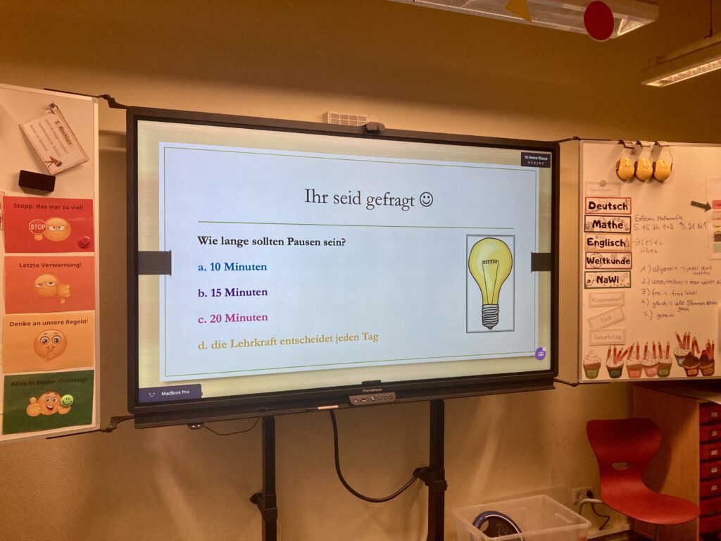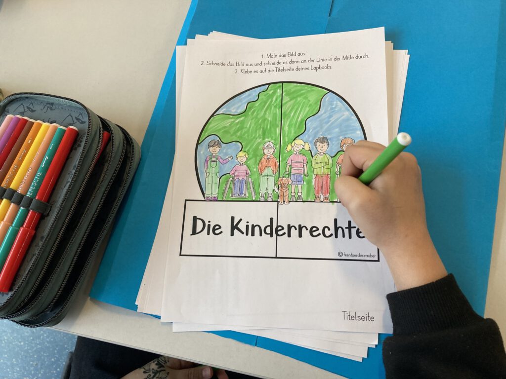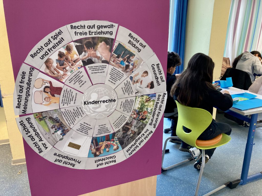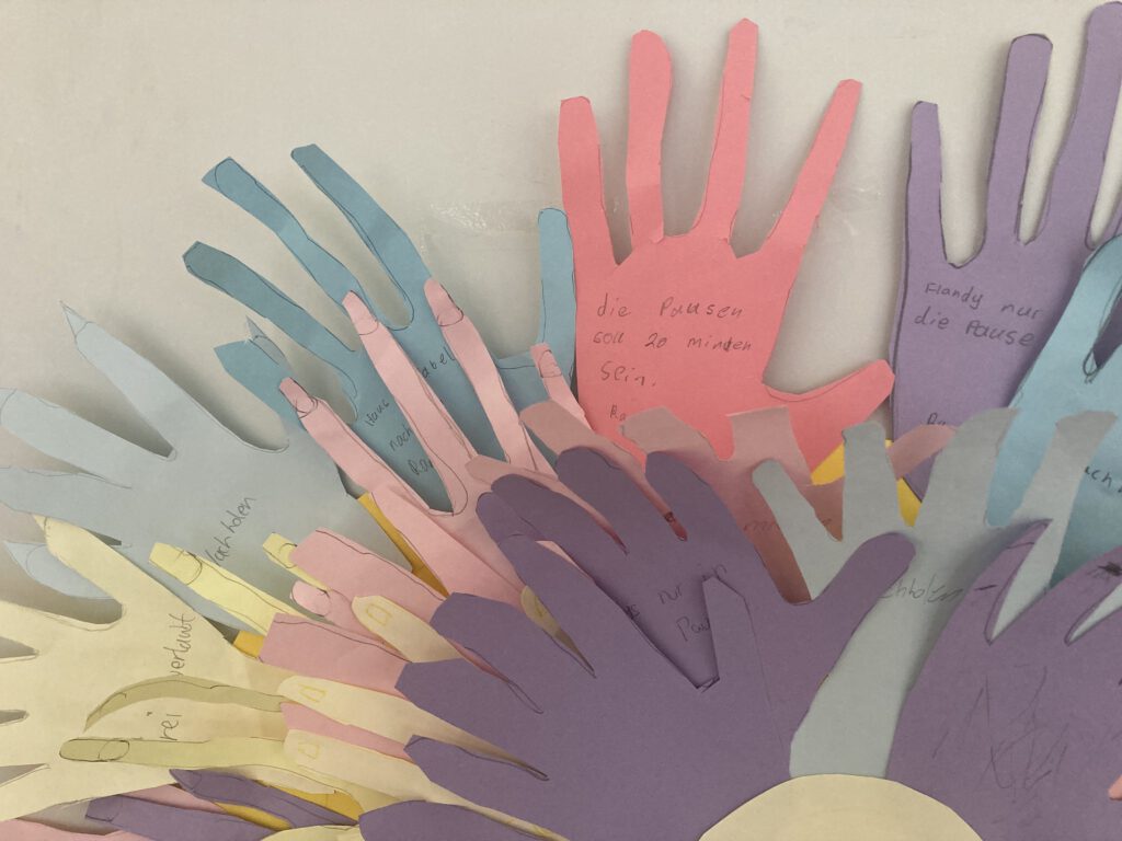 Jeder Jahrgang beschäftigte sich mit altersgerechten Themen rund um Demokratie. So nahmen die Fünftklässler an einer Meinungsumfrage rund um schulische Belange wie Hausaufgabenregelung, Pausendauer und Handynutzung teil, die zu einer lebhaften Diskussion im Klassenraum wurde. Für jede Antwort wählten die Kinder einen Stimmzettel in der entsprechenden Farbe und gestalteten daraus schließlich eine bunte Meinungsblume. Die Erkenntnis: „Die Blume ist nur so schön bunt, weil jeder seine Meinung sagen darf.“ Auch das Thema Kinderrechte fand Platz in der Vorhabenwoche. Sich bewusst zu sein, eigene Rechte zu haben und auf diese bestehen zu können, ließ die Kinder innerlich ein ganzes Stück wachsen.